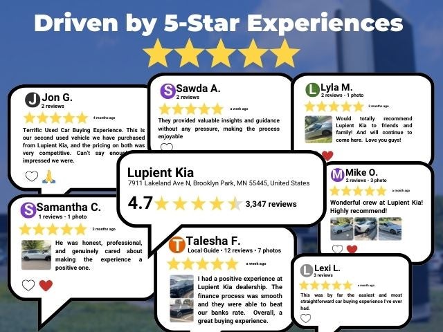 Lupient Kia is the highest rated Kia dealer according to Google ratings of all Minnesota Kia dealers from January 2019 to October 2025 with over 3,200 reviews. That is because we take customer service seriously and our job is not done when you leave. Plus, your first oil change is complimentary because we believe in starting your ownership journey right!